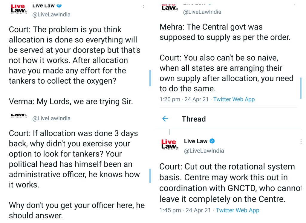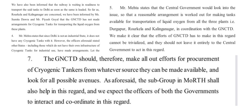 The Court also suggested that the central government and Delhi government work together to ensure a smooth supply of oxygen to hospitals. They also asked the Delhi Govt. to make all-out efforts to procure cryogenic tankers to transport oxygen from the production plants.