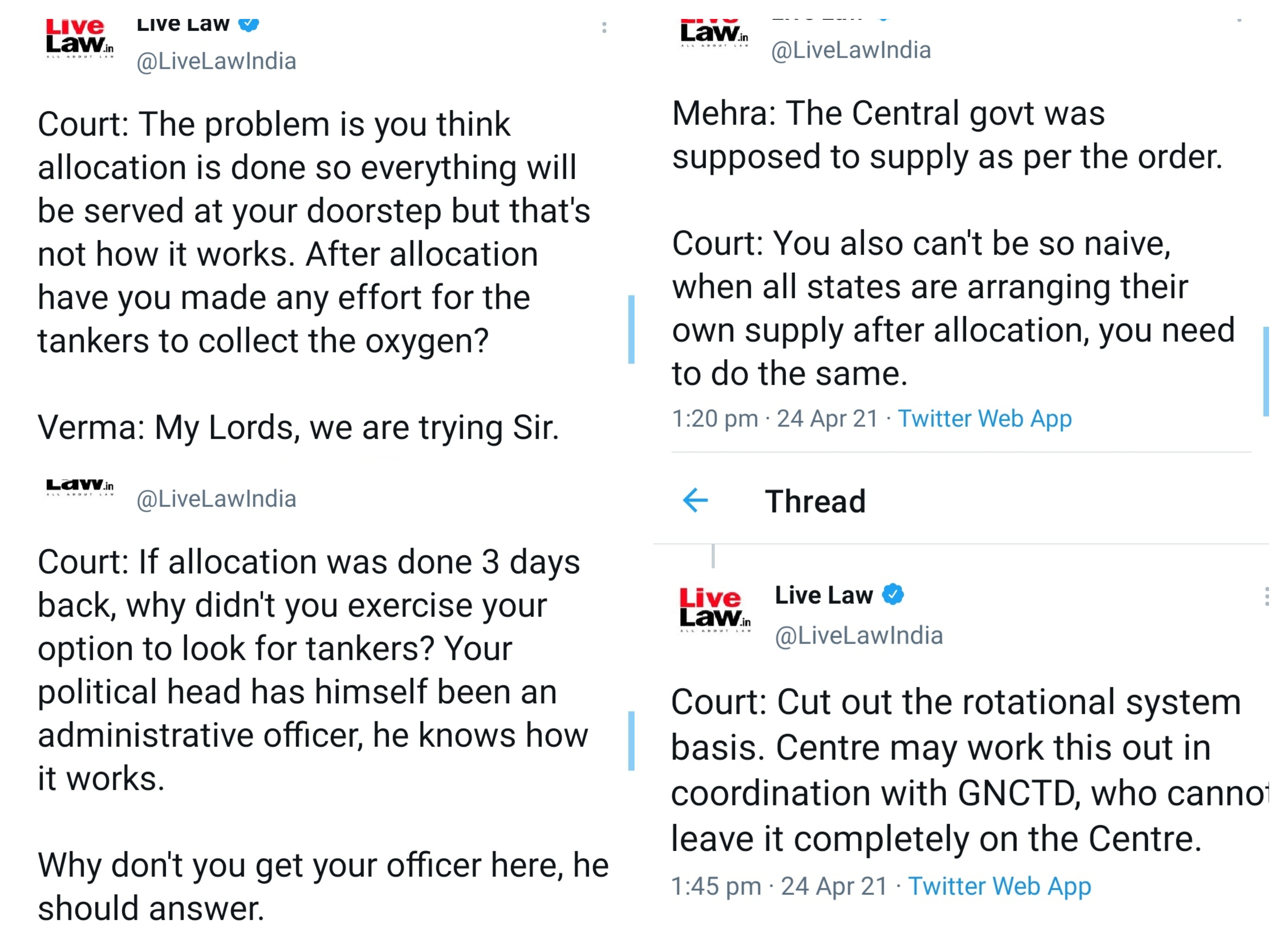 After initial reports on media, Max Hospital moved the Court, saying that they were on dangerously low oxygen supply levels. Delhi High Court had convened to hold an urgent hearing that exposed the ugly reality. The Court ordered that the “central government should review the allocation of oxygen on a day to day basis so that its utilization is achieved most efficiently.” Senior Advocate Rahul Mehra, appearing for the Delhi government, said that out of allocated 480MT, Delhi is getting 350-380MT because Arvind Kejriwal did nothing for transportation.